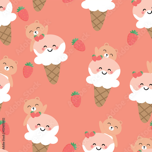 Seamless pattern with cute cartoon bears and strawberry ice cream, for fabric prints, textiles, colorful gift wrapping paper for children, flat style