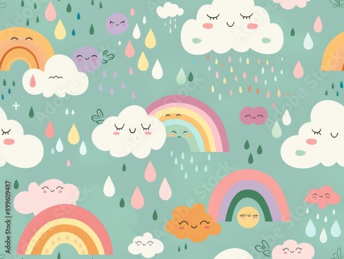 Seamless pattern with cute clouds, rainbows, and raindrops in pastel colors. Perfect for kids' designs and playful backgrounds.