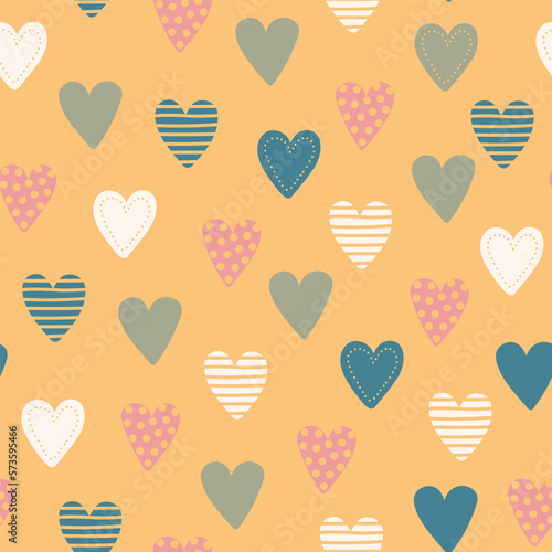 Seamless pattern with different hand drawn hearts. Spring color palette. Vector illustration.
