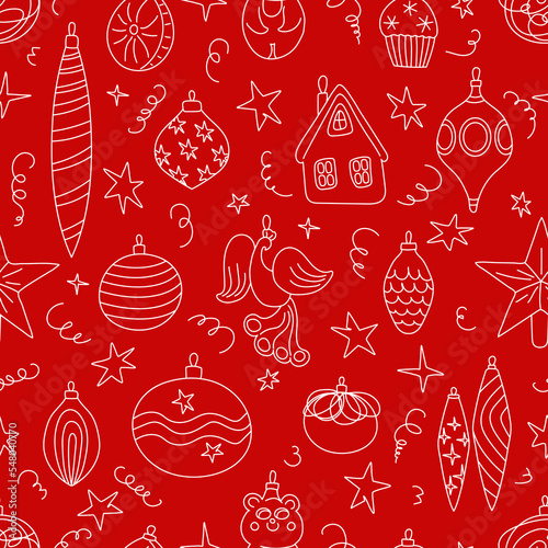 Seamless pattern with doodle Christmas baubles vector illustration. Hand drawn Xmas toys. White outline ornaments isolated on red background. Childish line print