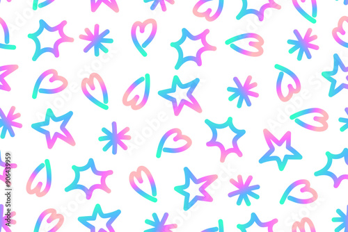 Seamless pattern with elements of holographic colors. Hearts and stars with gradient in pink and blue colors on white background. Cute pattern. Hand drawn doodles. Vector illustration.