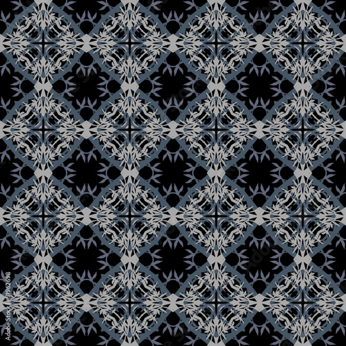Seamless pattern with floral motives. Seamlessly repeating ornamental wallpaper or textile pattern with hand drawn motives in black, gray and purple.