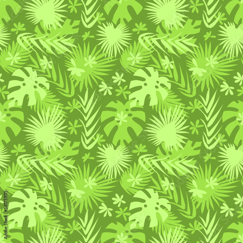 Seamless pattern with green tropical palm leaves on green background. Exotic foliage wallpaper.