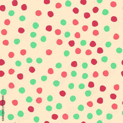 Seamless pattern with hand drawn circles. Abstract geometric spring pattern with pink, green and red circles. Random, chaotic pastel pink background with cute bubbles.