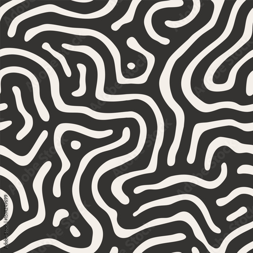 seamless pattern with hand-drawn maze lines, abstract black and white background, curved design, tile, surface, wallpaper