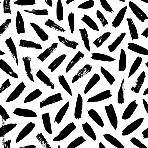 Seamless pattern with irregular black dashes. Simple geometric texture with short brushstrokes. Abstract background in Memphis style. Ink painted hand made texture. Vector black ink ornament.