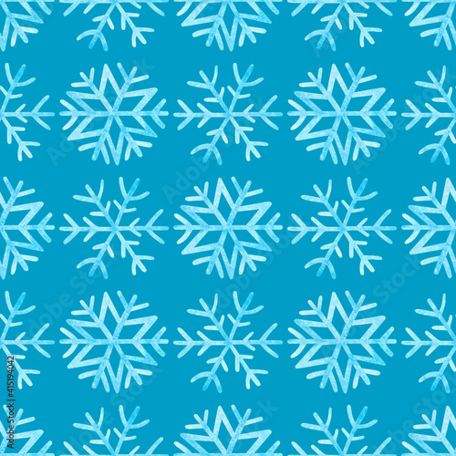 Seamless pattern with light blue snowflakes on a blue background. Christmas watercolor illustration with snowflakes. Print for wrapping paper, cards, banners, posters, web, fabrics, invitations.