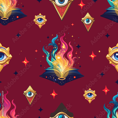 Seamless Pattern with Magical Books and Mystic Eyes. Design with Enchanted Books and All-Seeing Eyes. Mystical Pattern Featuring Eye Symbols
