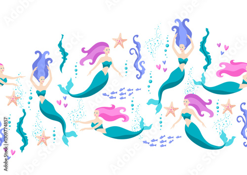Seamless pattern with mermaids. Image of underwater wonders or fabulous creations.