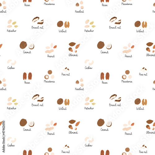Seamless pattern with nuts on white background and inscriptions. Cute doodle illustrations. Perfect for wrapping paper, etc.