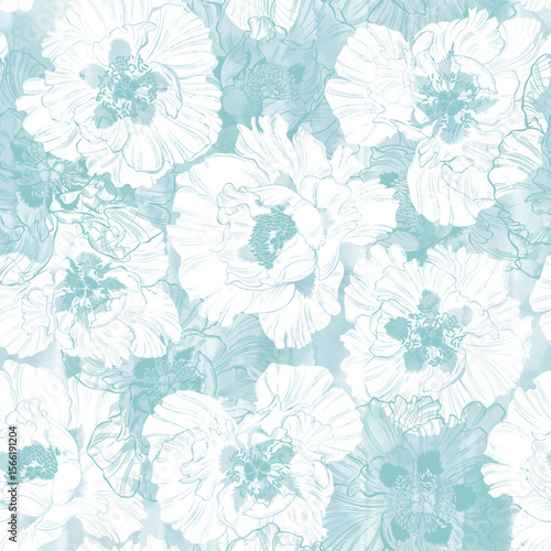 Seamless pattern with peony flowers on blue watercolor background. Vector illustration. Silhouettes and contours. Perfect for design templates, wallpaper, wrapping, fabric, print and textile.