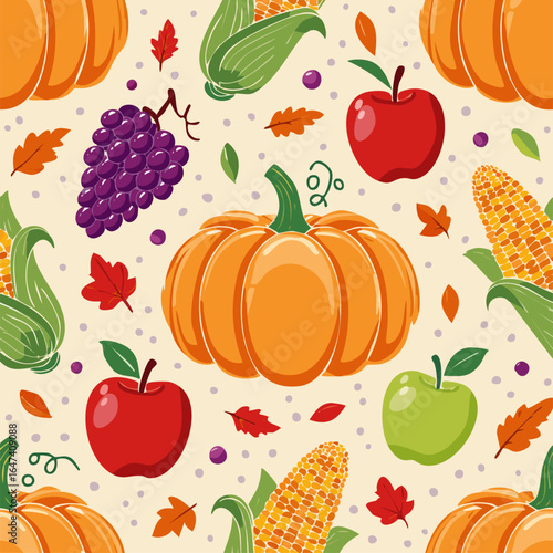 Seamless pattern with pumpkins, apples, grapes, corn, and leaves. Ideal for fall, Thanksgiving, and seasonal designs