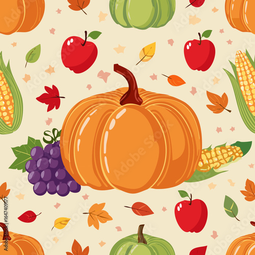 Seamless pattern with pumpkins, apples, grapes, corn, and leaves. Ideal for fall, Thanksgiving, and seasonal designs