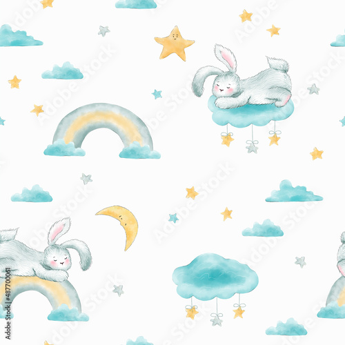 Seamless pattern with sleeping baby bunny rabbit and clouds, rainbows, stars. Illustration.