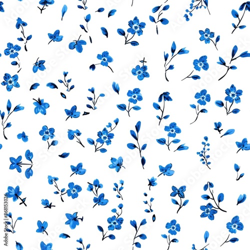 Seamless pattern with small blue hand-drawn flowers on a white background