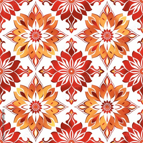 Seamless pattern with stylized red and orange floral mandalas and interconnecting abstract leaf elements on a white background