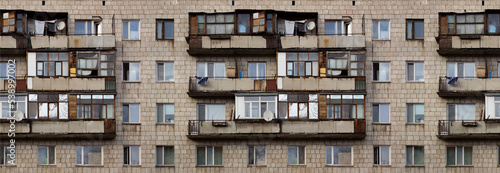 Seamless pattern with the facade of an old Soviet panel house in the Kazakh city of Pavlodar. Old balconies where things are stored and dried. Apartment building with windows