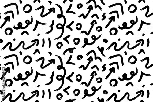 Seamless pattern with various geometric modern lines. Geometric shapes are drawn by hand with a bold brush. Arrows, circles, curls, asterisks and curved bold lines. Vector abstract pattern