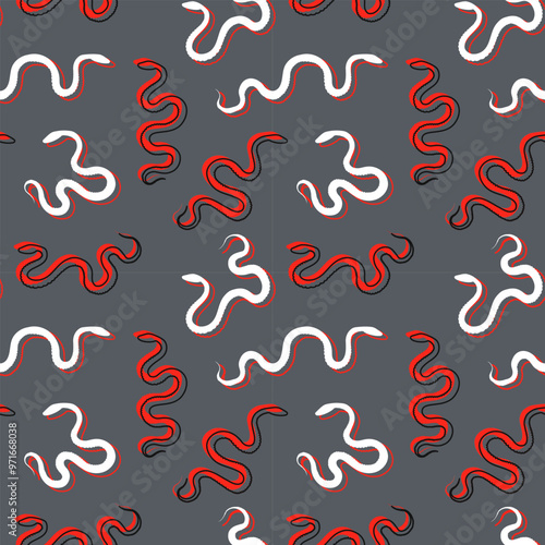 Seamless pattern with white and red snakes various shapes on grey background as wrapping paper or fabric design. Endless wallpaper or backdrop with different hand drawn reptiles for 2025 Year of Snake