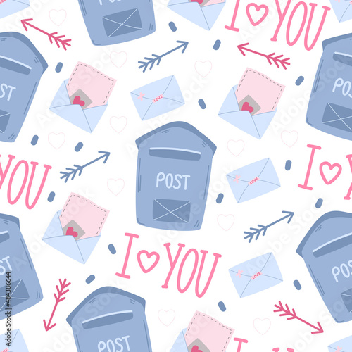 Seamless patterns. Postal elements. Mailboxes, envelopes. Romantic theme. Valentine's Day. Wrapping paper. Vector illustration in flat cartoon style.