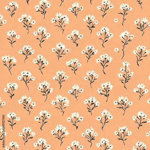 Seamless repeating pattern of small white flowers on a peach background perfect for textile or graphic design