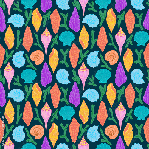Seamless seashell pattern.Vibrant ocean shells in bright colors. Underwater themed background. Perfect for textiles, wallpapers, wrapping, packaging, stationary, decorations, crafts, fabrics.