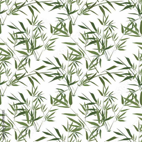 Seamless tropical pattern. Green leaves, bamboo branches on a white background.