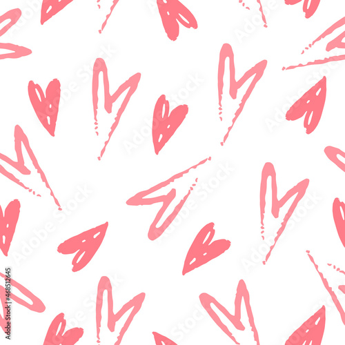 Seamless vector pattern made by hand drawn pink hearts on a white background.