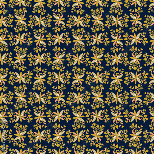 Seamless vector pattern of ornamental lined abstract flowers on dark background