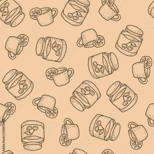 Seamless vector pattern with tea and cherry jam in beige for craft, wrapping, textile, ceramic