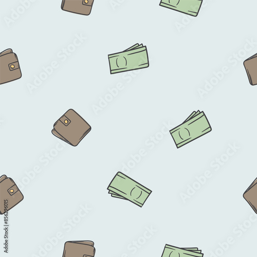 Seamless vector pattern with wallet and money. Set of repeating commerce, finance elements for background, print