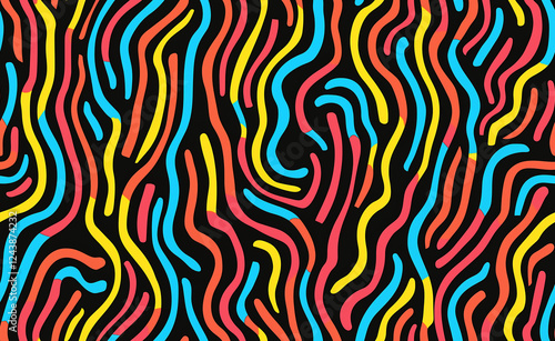 Seamless vibrant abstract wavy line pattern with colorful, red, yellow and blue strokes on black background