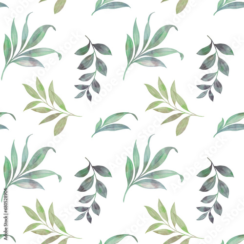 seamless watercolor pattern, abstract background for the design of wrapping paper, textile, wallpaper, drawn branches with leaves on a white background