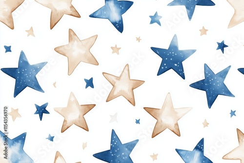 Seamless watercolor pattern of cute blue and beige stars on a white background ideal for children s room decor playful design elements