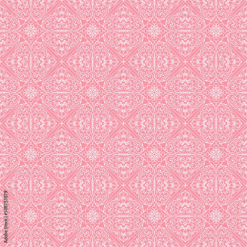 seamless white pattern on pink background. Seamless pattern with hearts and weaving. Lace, knitting,geometry, background,