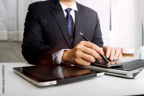 Searching Browsing Internet Data Information with blank search bar.businessman working with smart phone, tablet and laptop computer on desk in office. Networking Concept