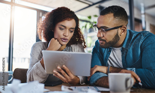 Searching for an insurance policy that suits their needs. Shot of a young couple using a digital tablet while planning their budget together at home.