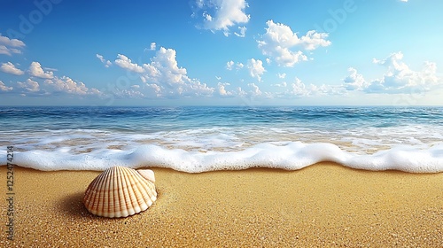 Seashell on sandy beach with ocean waves, used for travel and coastal backgrounds.