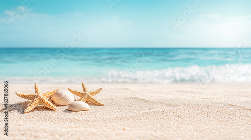 Seashells and starfish on sandy beach under clear blue sky. Bright summer banner with space for text
