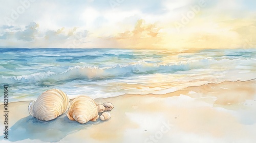 Seashells on Sandy Beach at Sunset Watercolor Painting