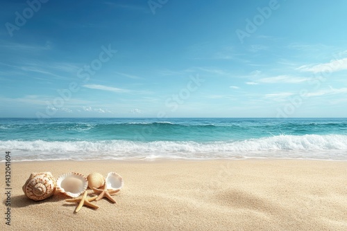 Seashells scattered on sandy beach with gentle waves under a clear blue sky