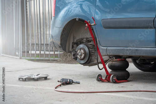 Seasonal tire changing progress: blue car on air jack, wheel removed, brake disc visible, impact wrench and hubcap on ground, outdoor auto service, close up.