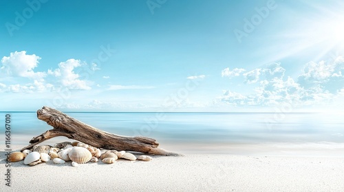 Secluded shoreline adorned with seashells and driftwood, gentle waves lapping at the sand, serene escape from the world