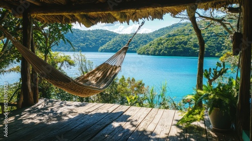 Secluded tropical getaway with hammock overlooking pristine azure waters and lush hills