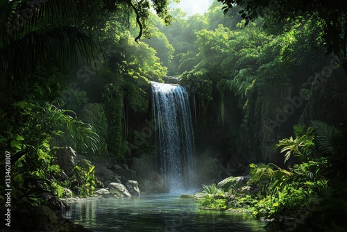 Secluded Waterfall Cascading Through Lush Jungle Foliage in a Serene Rainforest Setting