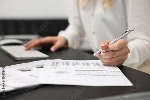 Secretary working with document at table in office, closeup