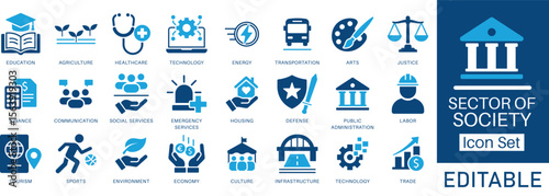 Sector of society icon set. Features for education, healthcare, agriculture, economy, justice, culture, and more. Perfect for infographics, reports, and web design.