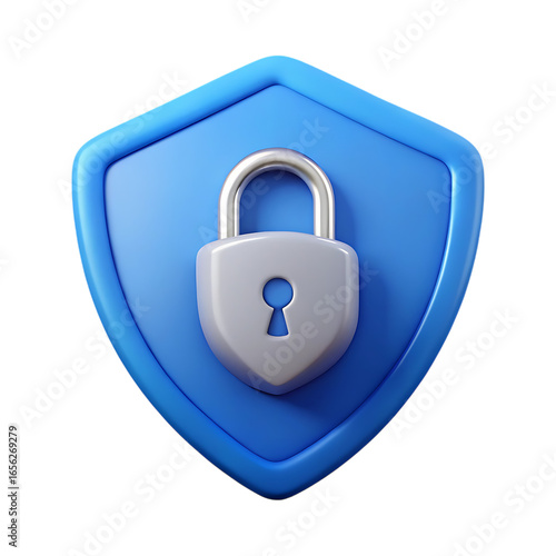 Secure blue shield with silver padlock symbol representing data protection and cybersecurity safety transparent background