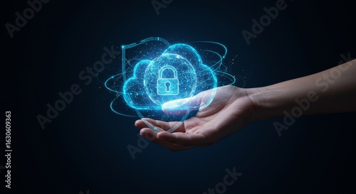 Secure Cloud Data Protection - Hand holding a glowing cloud with a padlock, symbolizing secure data protection and cloud security