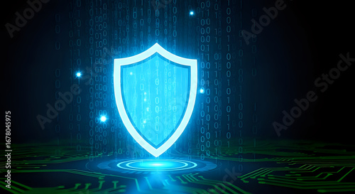 Secure digital shield glowing amidst cascading binary code and illuminated circuit board pathways